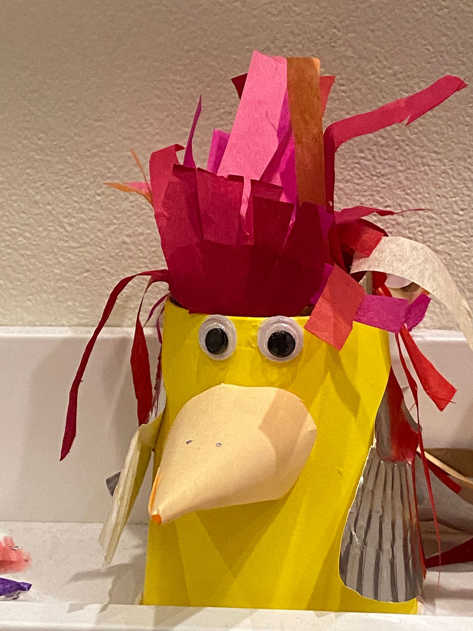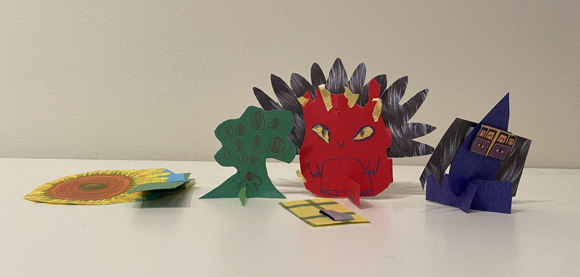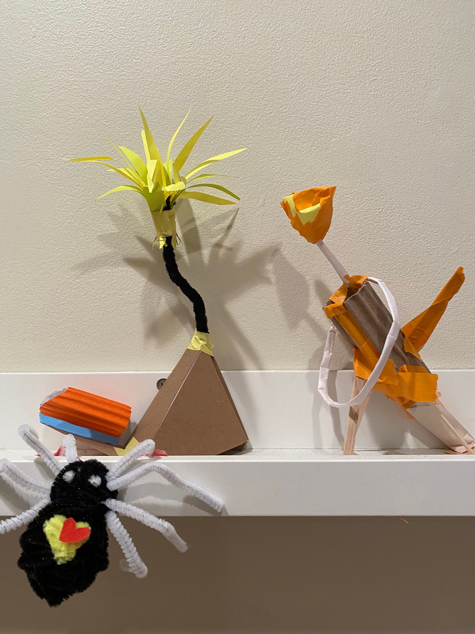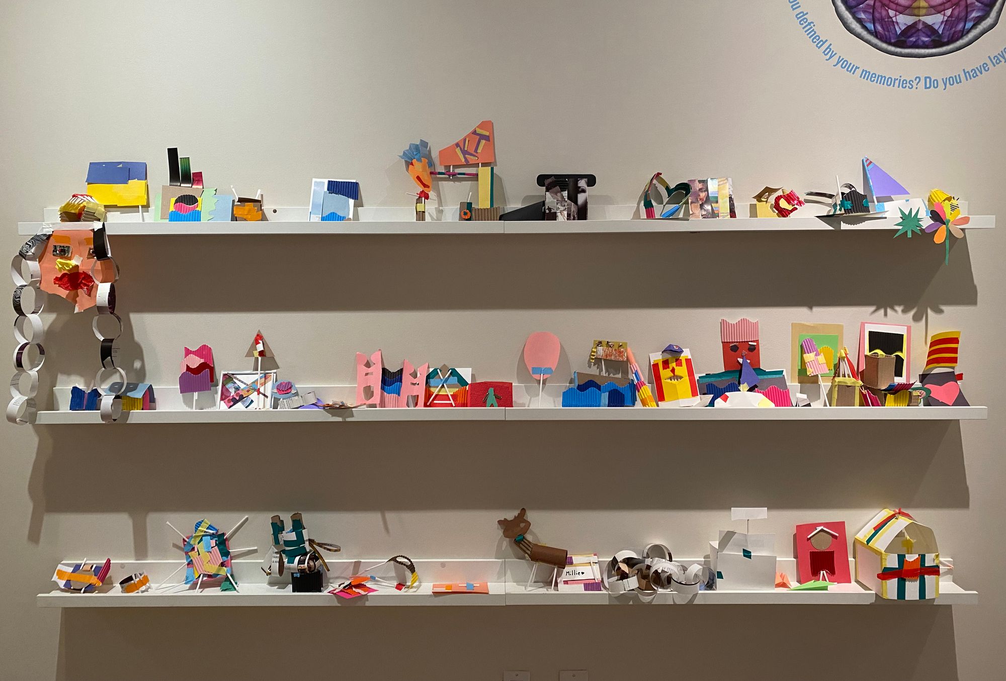 It was left on the paper supplies shelf – the other display shelves were chock-full of other selfies. I have interpreted that this group of makers have at least two reflections of the inner self: a red, angry, feathered presence, forward-looking and confrontational; and a sly purple self, suggestively demure while somewhat menacing too, with deep bookish eyes. Other potential Inner Selfies are a fruit-filled tree selfie, a flattened sun-like figure and another latticed figure lying flat in front. As a gathering, these selfies offer me a dramatic family story, where my impressions are as fantastical as those choreographed by their makers (who are often families with young children). Why does this all matter to the museum’s ability to engage with people, telling and sharing each other’s stories? These creative moments offer glimpses of how museums facilitate connecting people and communities.