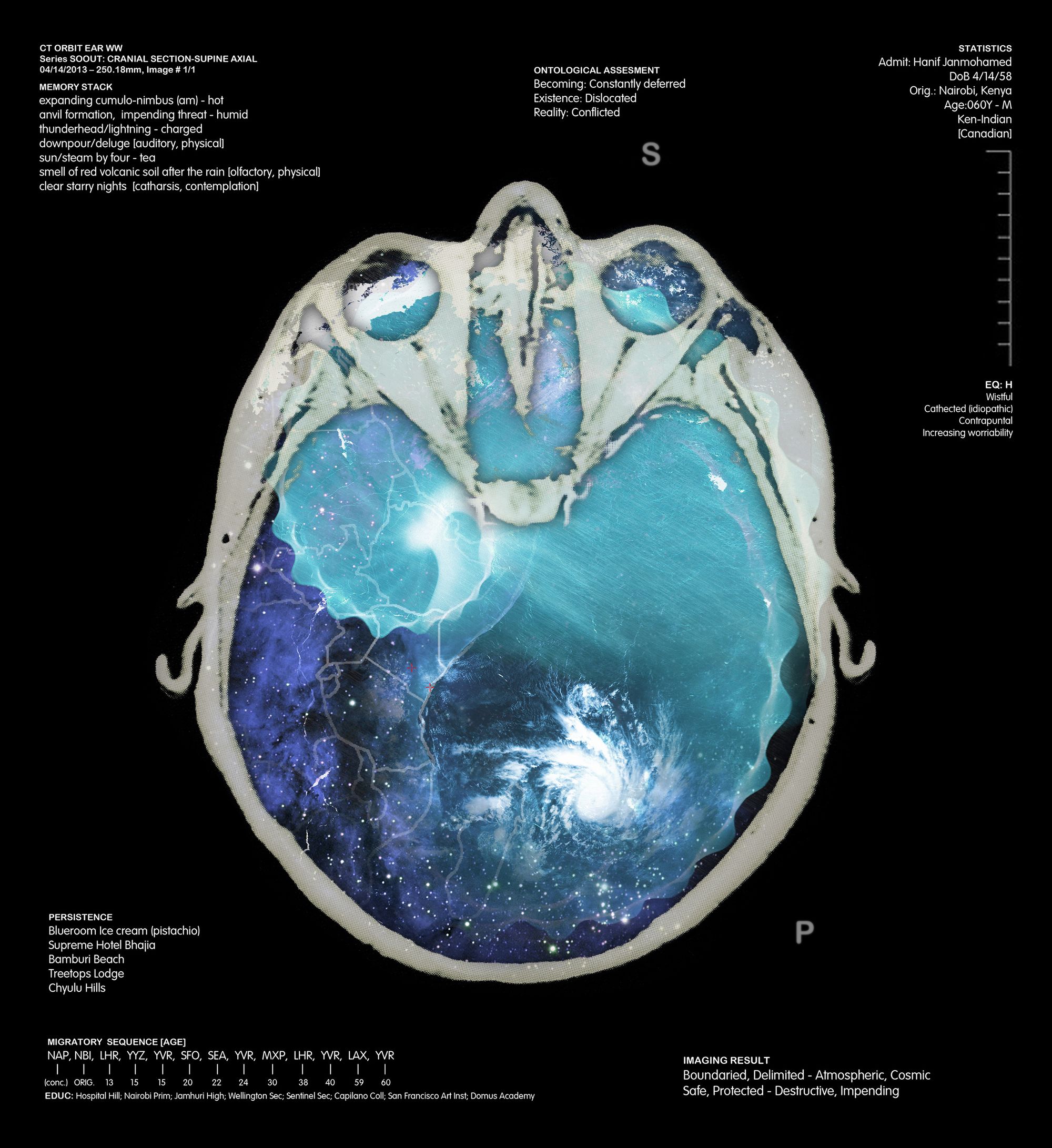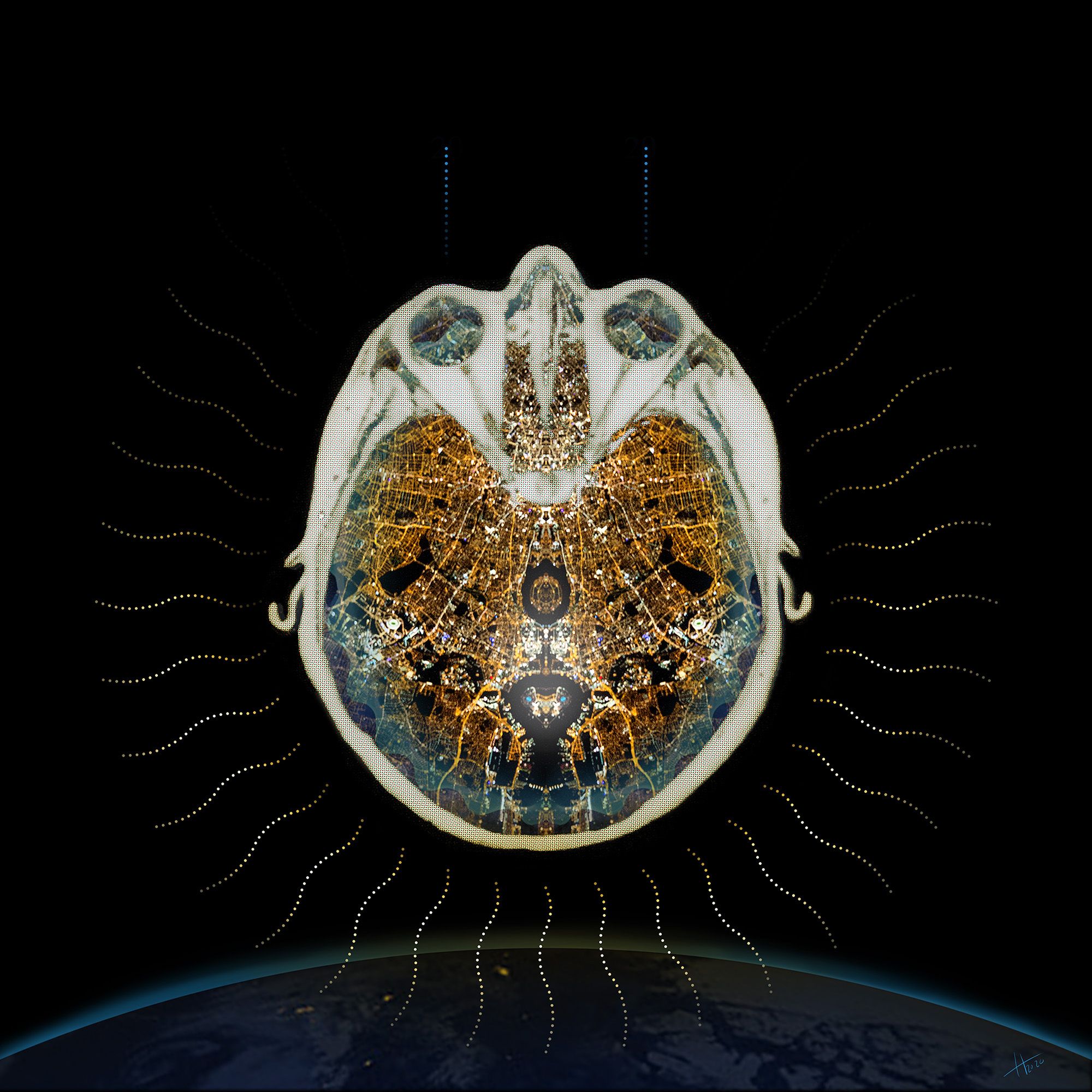 The Inner Selfie Project has its origins in a self-portrait I made in 2013. Cranial Cosmology, a backlit digital collage of medical scan, earth imaging, cartography and data visualization – its origins were an ongoing series called Brain Terrains, a quixotic exploration of the in-between world of human experience using medical and satellite imaging – whose origins lie in an earlier body of work called Cellular Landscapes, a scenographic approach to an imagined cellular life.