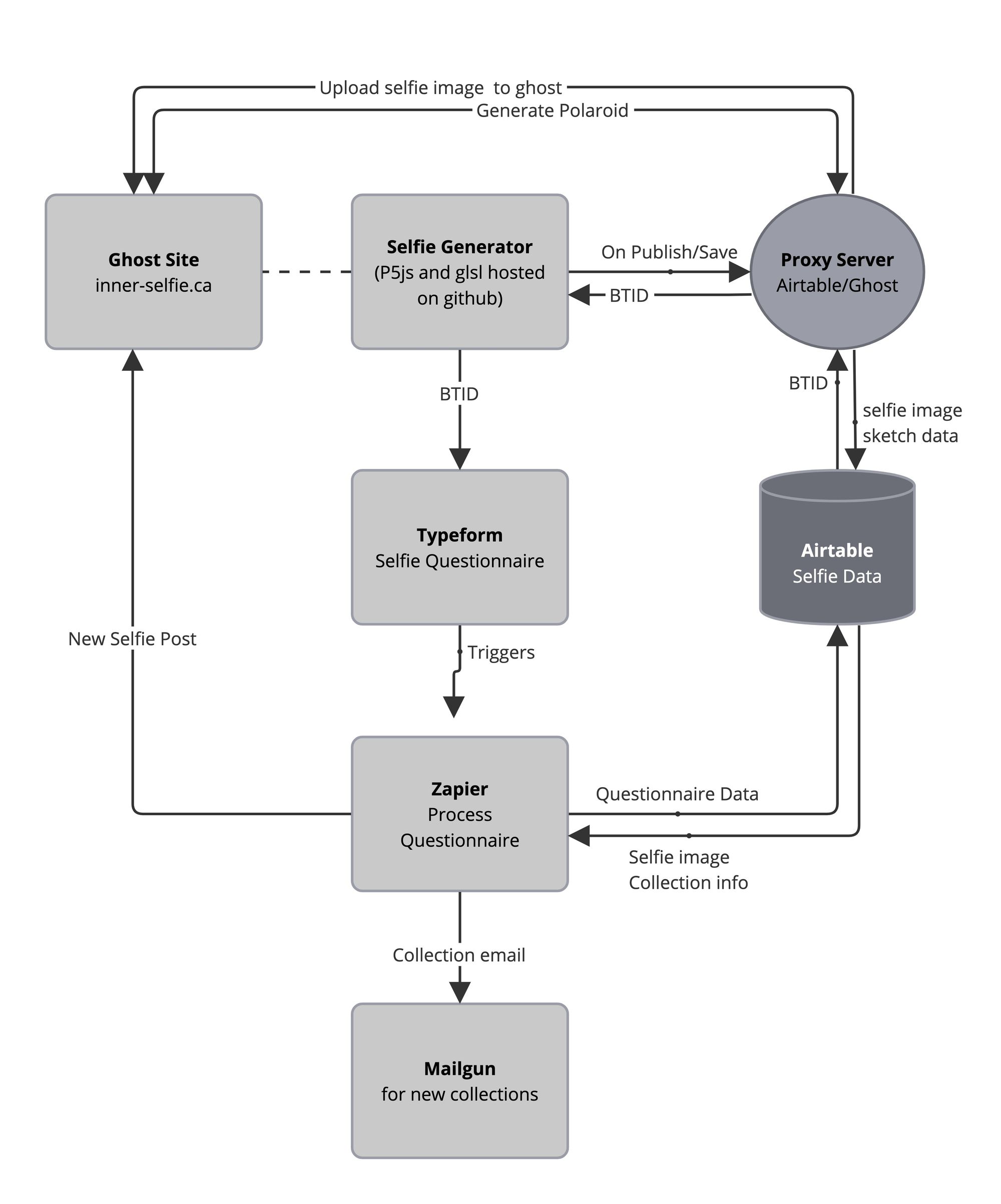 Below is the tech stack we ended up with. Ghost is the CMS and website framework. We customized an existing theme to get to the look we wanted. The selfie generator is Javascript with GLSL using p5js. It's hosted separately on Github, though this is mostly a side effect of the development schedule and could be moved to Ghost. The selfie data is stored on Airtable which is a web database service. It has a nice visual interface to the data and works nicely with Zapier. The questionnaire is done with Typeform, a standard in the survey world (but constrained in some unexpected ways!). When a new questionnaire is completed it triggers an event in Zapier which processes the data and interfaces with Airtable and Ghost to generate the new post and potentially communicate with the user through Mailgun if a new collection was created. The glue holding the components together is a custom Proxy Server running on Digital Ocean which uses the Airtable and Ghost API to save the selfie image and generate selfie Polaroids.